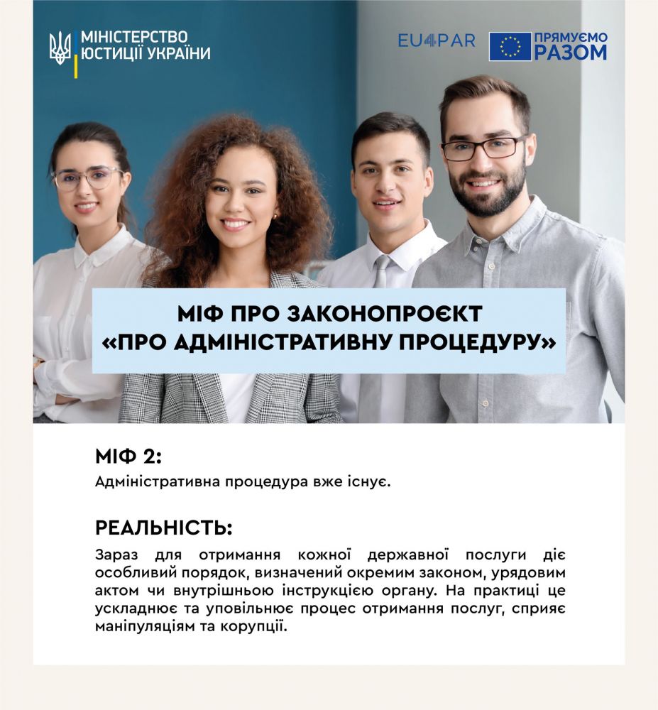 Міф №2: Іноді можна почути таку думку: "Навіщо ухвалювати закон про адміністративну процедуру, якщо вона в Україні вже існує?" Насправді ж це не так.