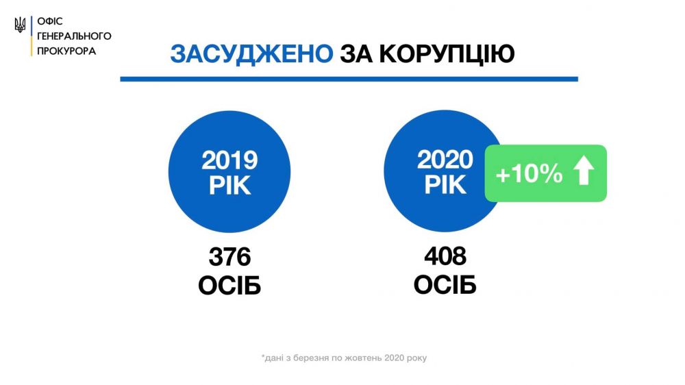 Ірина Венедіктова зазначила, що щодня правоохоронці викривають в середньому 44 корупційних правопорушення. У період з березня по жовтень 2020 року система органів правопорядку викрила 7748 таких злочинів. На 50% зросла кількість осіб, яким повідомлено про підозру в корупції. З березня по листопад - 2374 підозрюваних, тоді як у минулому році було всього 1606.