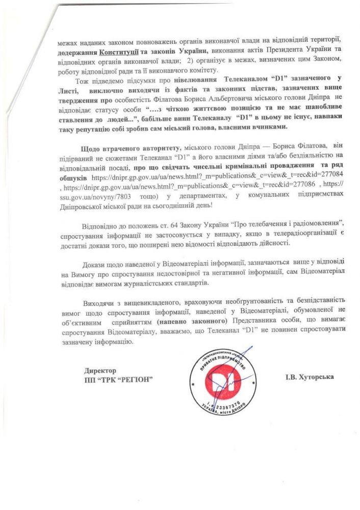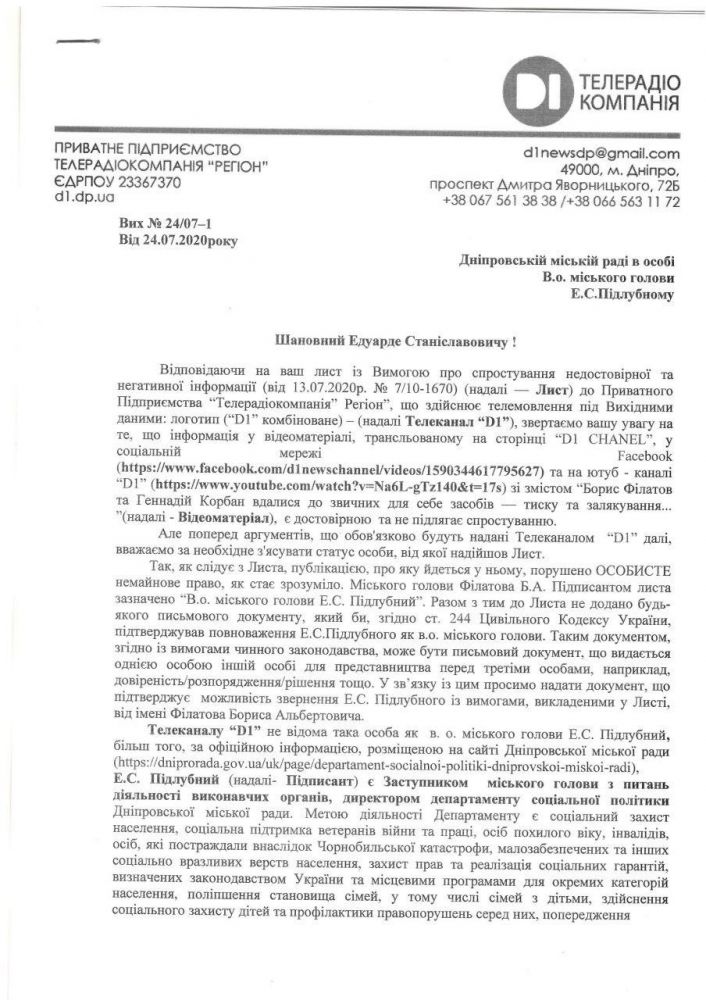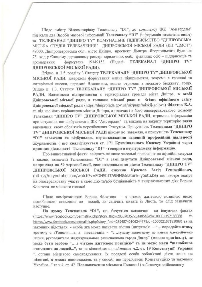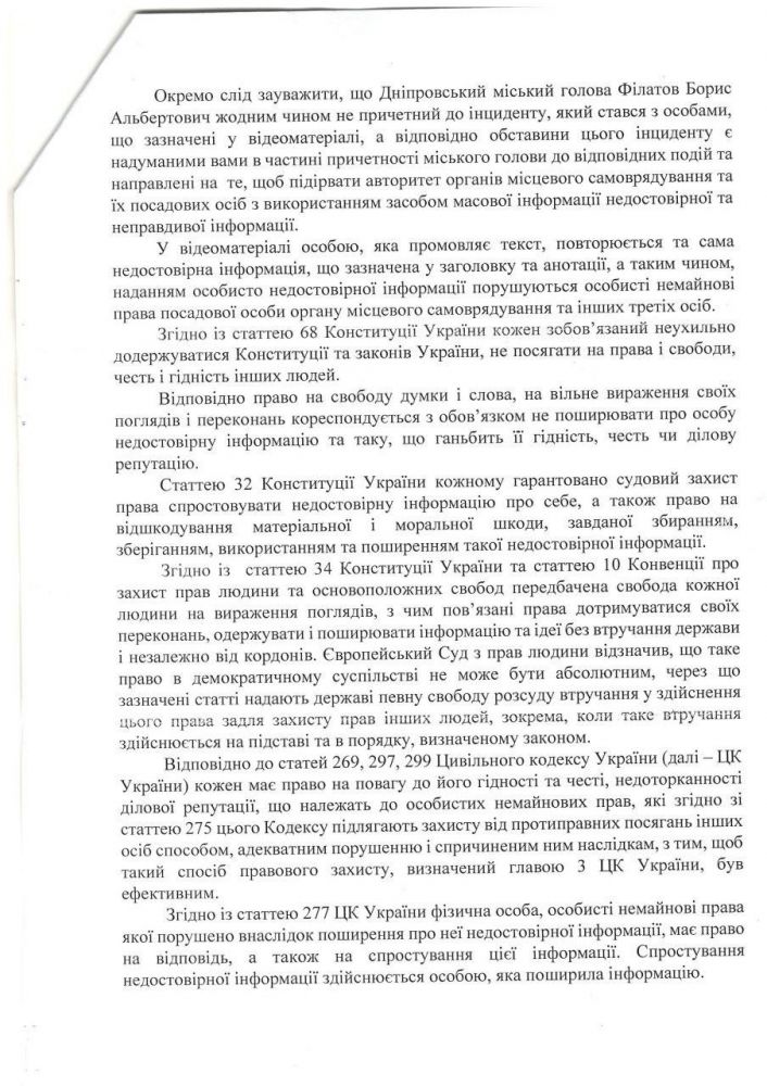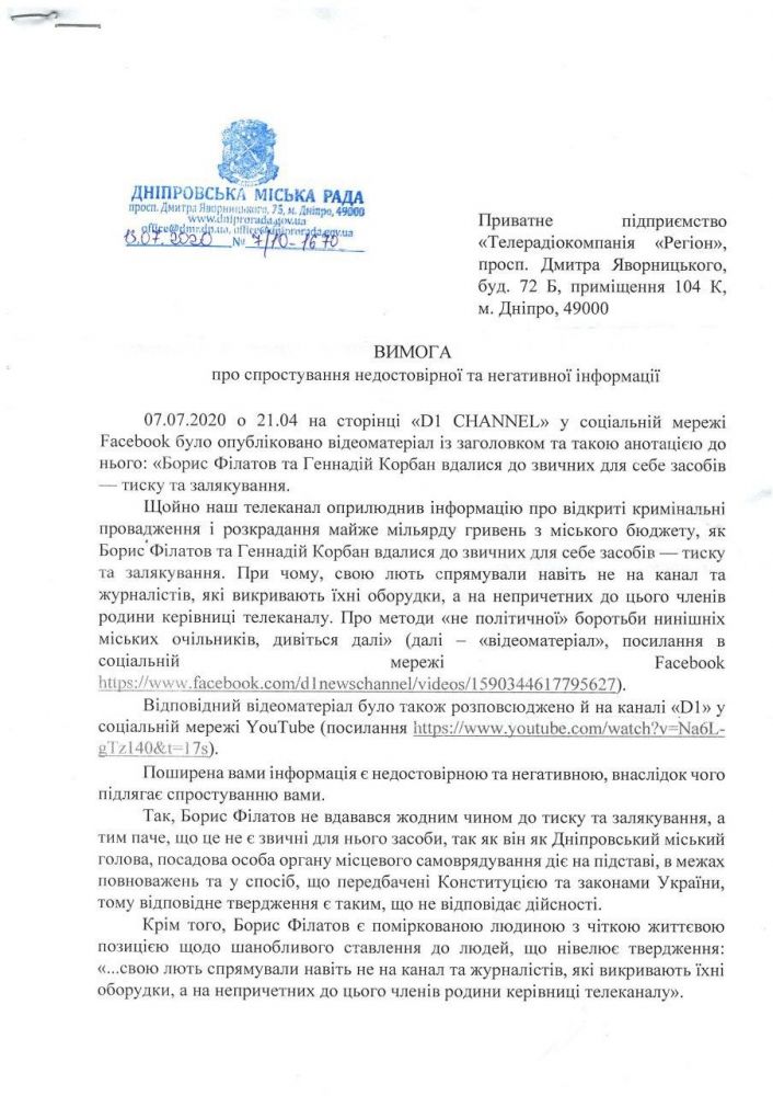 У вимозі йдеться про те, що матеріал, який вийшов в ефірі телеканалу та на офіційній сторінці у соціальних мережах, є недостовірним та негативно впливає на репутацію міського голови Дніпра Бориса Філатова. ![]()