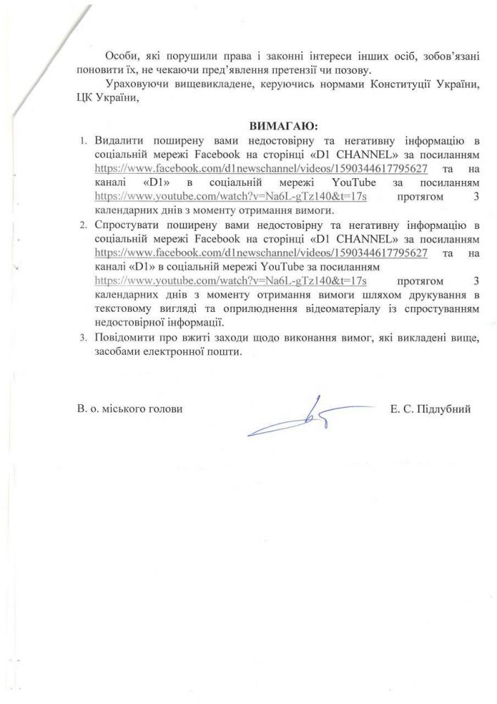 Офіційне звернення від міської ради надійшло від, нібито, виконуючого обов’язки міського голови Едуарда Підлубного. Проте, в.о. із прізвищем Підлубний юристи телеканалу у офіційних джерелах так і не знайшли. Що піддає сумніву достовірність самої Вимоги.