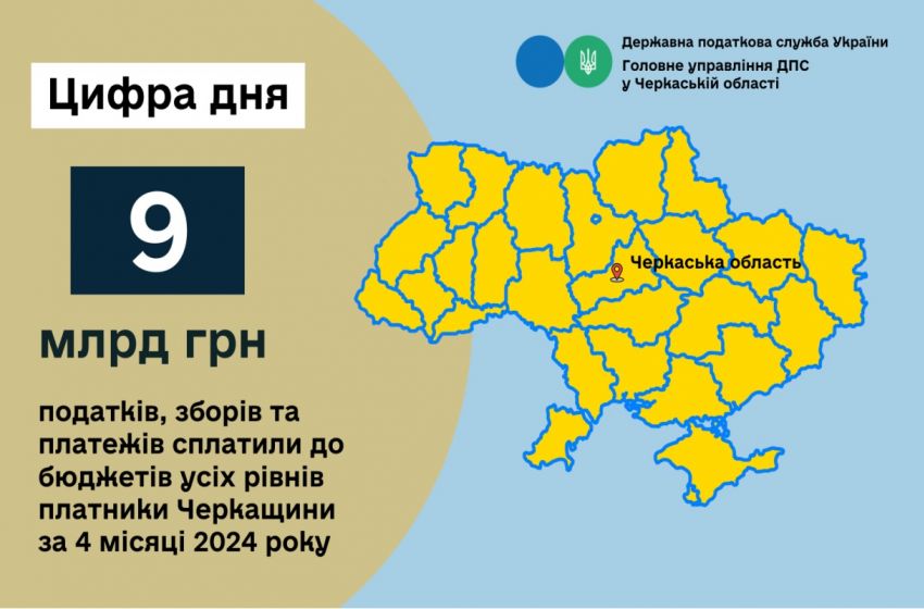 9 034 млн грн податків, зборів та платежів сплатили до бюджетів усіх рівнів платники Черкаської області за січень-квітень 2024 року. В.о. начальника ГУ ДПС у Черкаській області Володими
