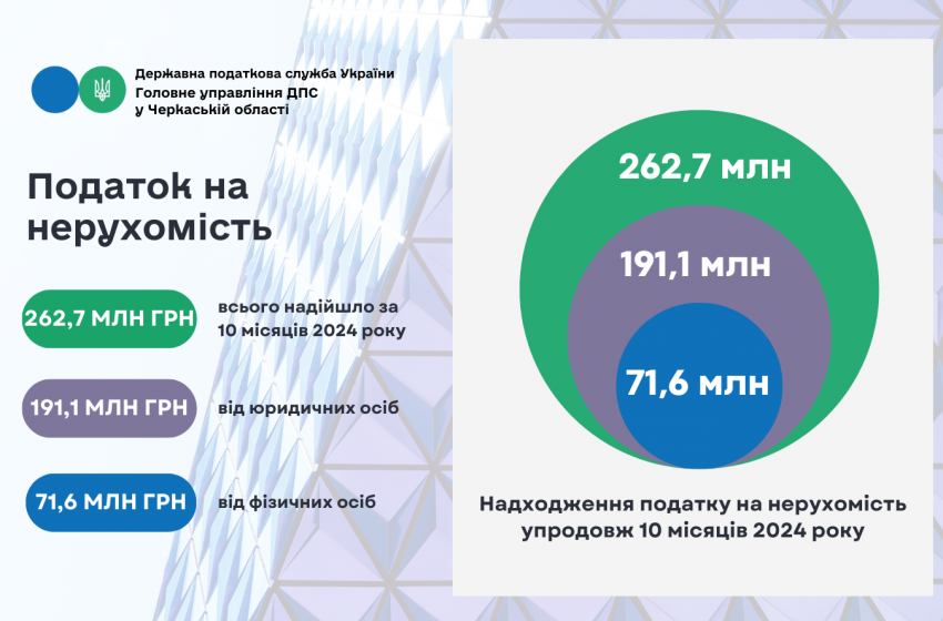 За результатами десяти місяців 2024 року місцеві бюджети області отримали 262,7 млн грн від податку на нерухомість. Про це повідомив в.о. начальника Голов