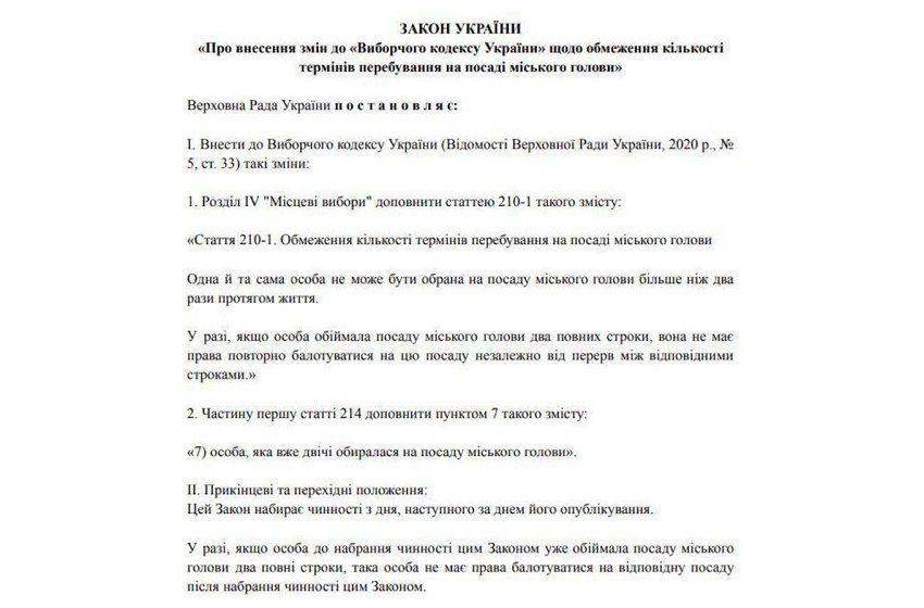 У Верховній Раді збирають підписи, щоб зареєструвати законопроект "Про внесення змін до "Виборчого кодексу України" щодо обмеження кількості термінів перебування на посаді міського голови".