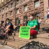 Протестувальники сидять і навіть лежать під Київською міською державною адміністрацією з плакатами «Місто для людей, а не для авто», «Маю право дороги», «Київ небезпечне місто».