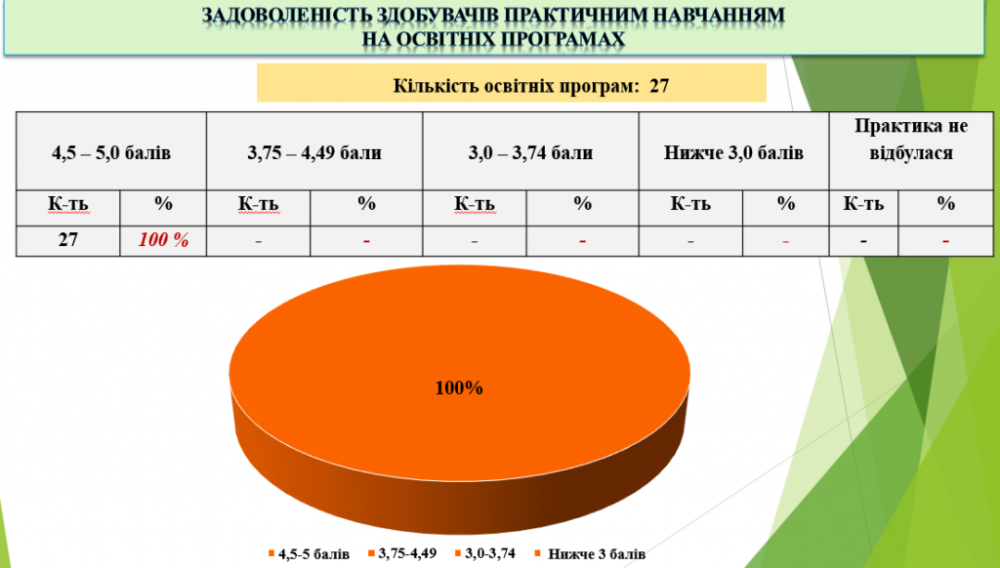 Якість викладання на освітніх програмах становить 100%. Задоволеність здобувачів практичним навчанням на освітніх програмах знаходиться в межах 4,5–5 балів і становить 100%.